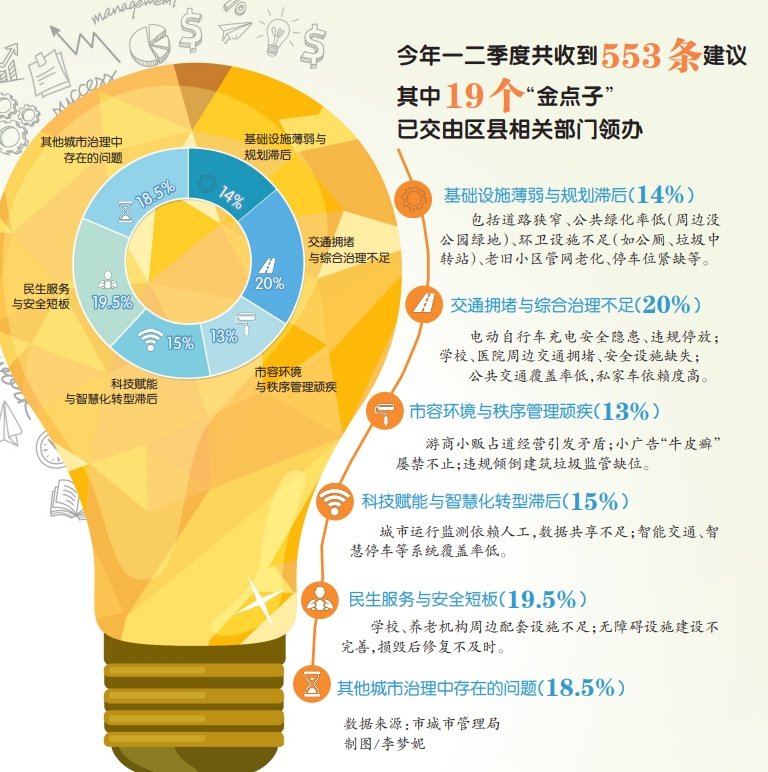 重庆探索超大城市现代化治理新路子,要广纳众智、形成合力。今年1月22日,市城市管理局、重庆日报联合启动“城市治理我建言”超大城市现代化治理“金点子”征集活动,吸引了社会各界人士踊跃参与、积极建言。近日,今年前两季度的“金点子名单”出炉,其中不少“含金量”高、具有创新性和可操作性的建议,正在或已经落地转化为民生项目,还有不少“金点子”被区县及相关部门采纳,纳入城市治理的规划中。这些“金点子”如何反映民生诉求,实现民意表达与公共决策的双向奔赴?连日来,记者进行了探访。